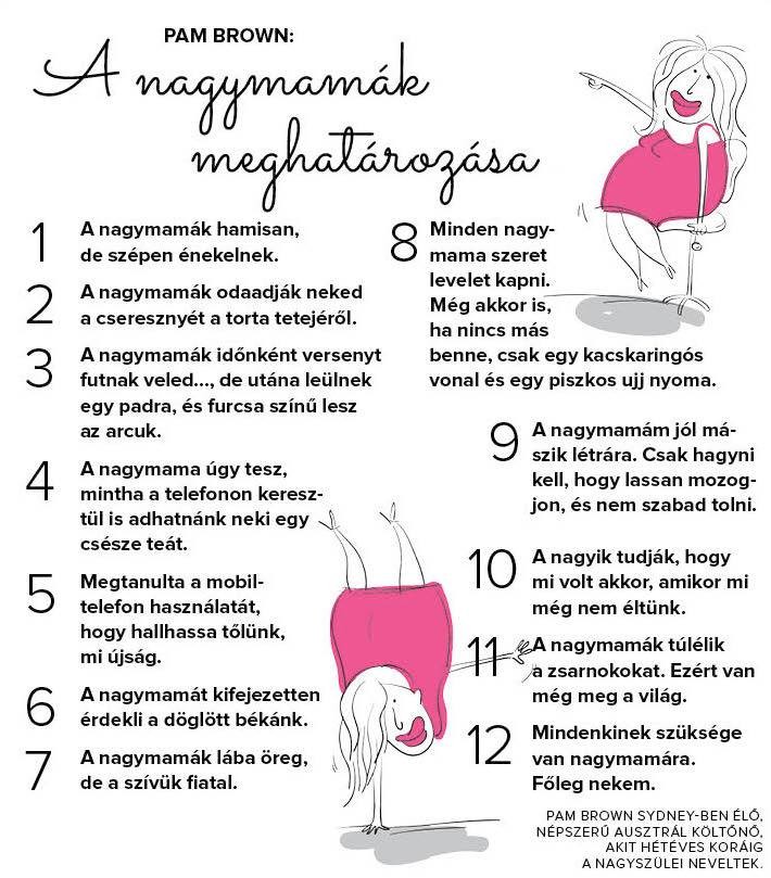 Végtelenül bájos nagymamás idézetfüzér kering a neten, mely Pam Brown Sydney-ben élő költőnő tollából származik. Kedves, igaz, gyermekien tündéri gondolatok nagymamákról, akik az unokák számára a világot jelentik.